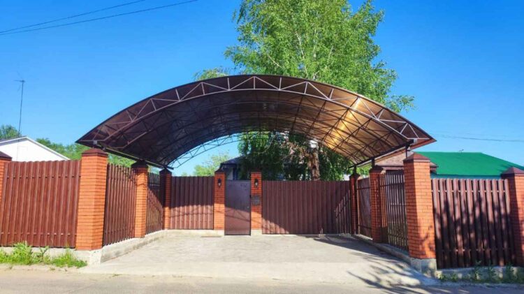 Конструкция арочных навесов состоит из каркаса, который может быть выполнен из металлических труб или профилей, и кровельного покрытия. Арочная форма не только выглядит привлекательно, но и повышает прочность конструкции, позволяя ей выдерживать значительные нагрузки. Такие навесы могут быть как отдельно стоящими, так и примыкающими к стене здания. Это делает их универсальными и удобными для использования в различных условиях.