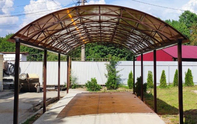 Навес односкатный арочный из поликарбоната, бетонирование стоек, изготовление ферм, монтаж и обшивка поликарбонатом.